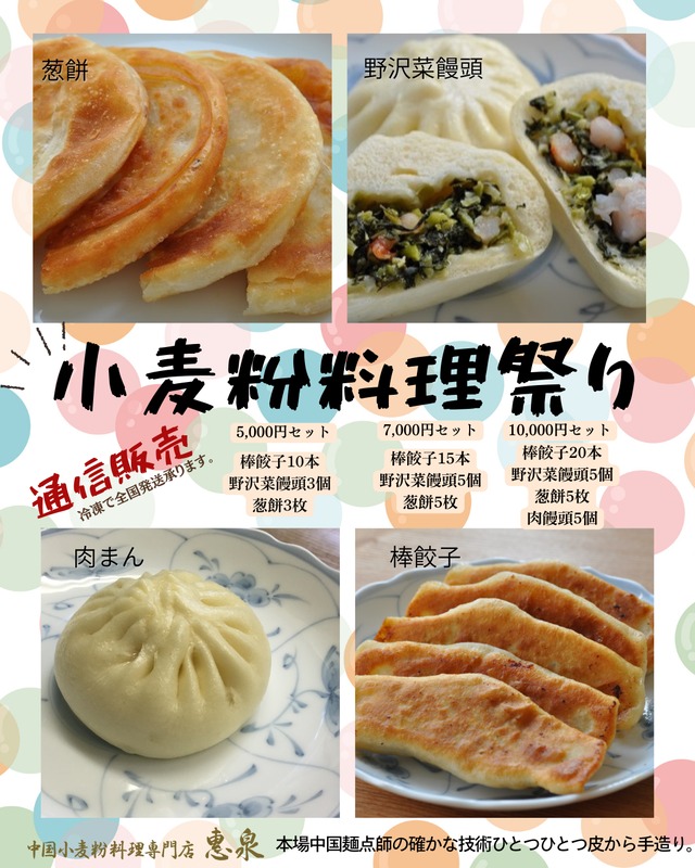 本場中国麺点師の確かな技術 ひとつひとつ皮から手造り。 小麦粉料理祭りはいかがでしょうか。 【7000円セット内容】 棒餃子15本 野沢菜饅頭4個 葱餅4枚 冷凍でお届けいたします。